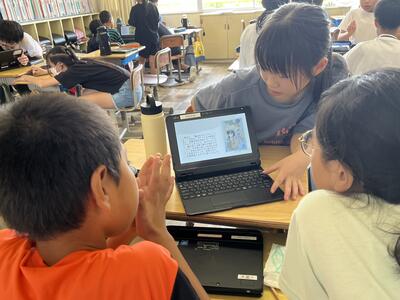 発表した後、友達の話を聞いて読みたいと思った本を借りにいく子供たちでした。この学習をとおして、プレゼンテーション力と読書への意識が高まりました。