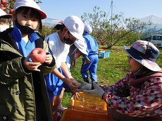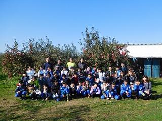 今日はとてもよく晴れた1日でした。きれいな青空のもと、3年生の子どもたちはりんごの収穫をしました。
