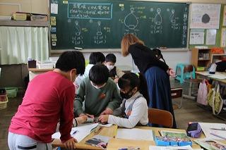 豆電球と乾電池をどのようにつなぐと明かりがつくのか、グループ毎に確かめました。「思った通り。当たった!」「予想と違った!」と一つ一つ確かめながら、どんな場合につくのかを確かめました。