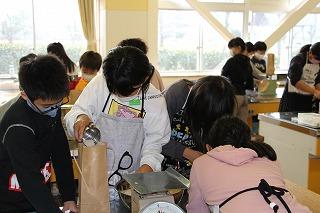 百姓寺子屋の皆さんのご指導で収穫した「はえぬき」を、1キロずつ袋につめます。正確に1キロになるように量り、こぼさないように慎重に作業しました。