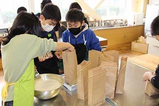 5年生は、総合的な学習で収穫した米の袋づめを行いました。