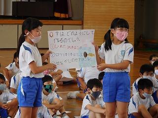本校の3年生は、総合的な学習で学んだことをもとに、イバラトミヨについていろいろ教えてあげました。「巣を作る様子」「とげの役割」「オスとメスのちがい」など、クイズ形式で出題し、説明をしました。
