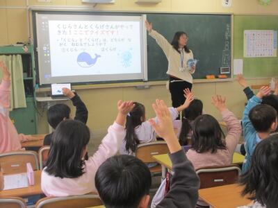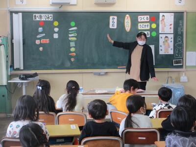 4時間目には、給食センターから栄養教諭の白幡先生がいらっしゃって、「食べ物のひみつ」のお話をしてくださいました。赤・黄・緑の食べ物をバランスよく食べると、体にとてもいいことが分かりました。