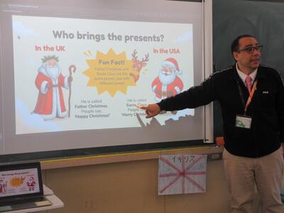 18日の中間休みには、ALTのチアゴ先生が「いろいろな国のクリスマス」のお話をしてくれました。クイズも楽しかったです。